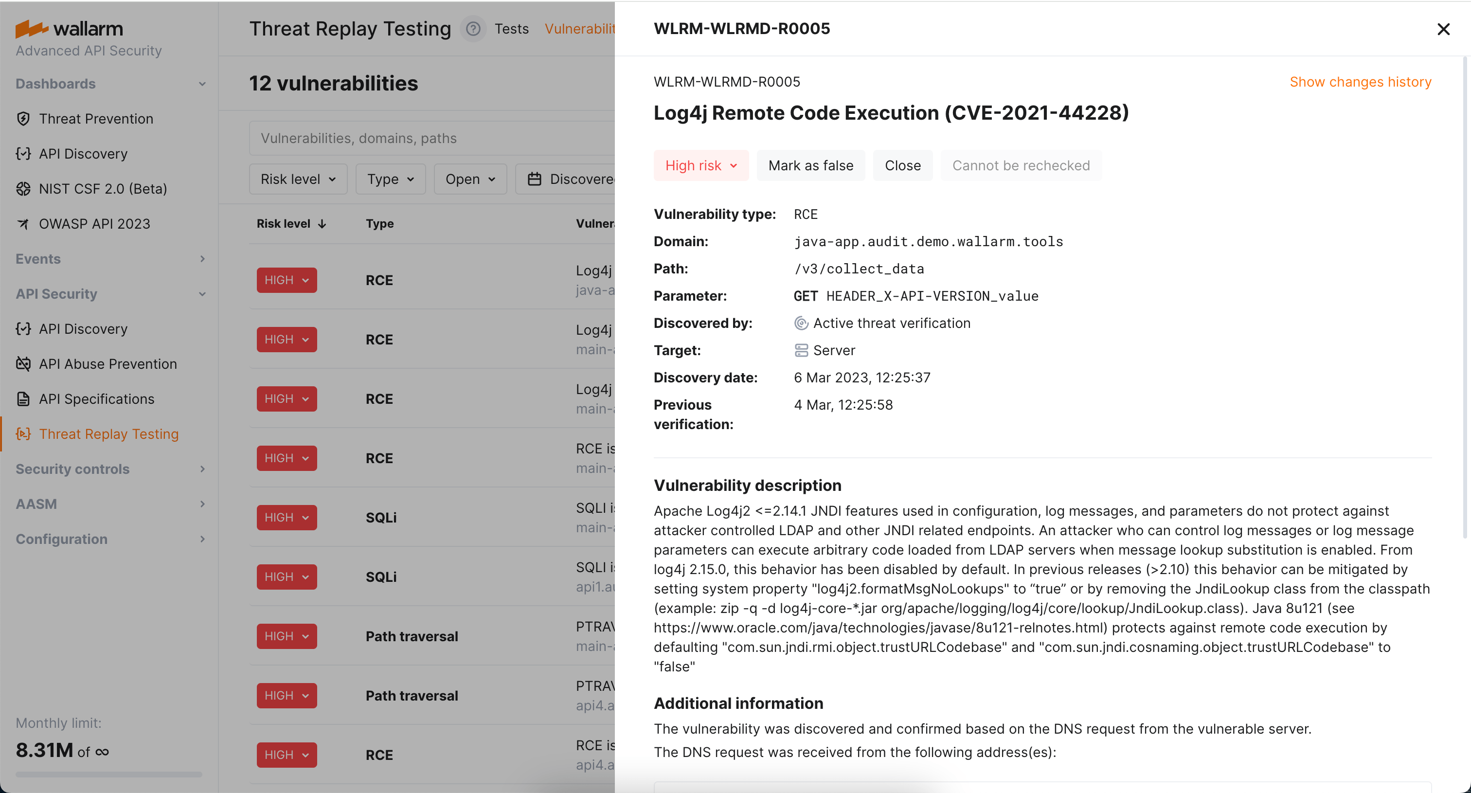 In Wallarm Console, go to Threat Replay Testing → the Vulnerabilities tab to see the list of vulnerabilities found by Threat Replay Testing.