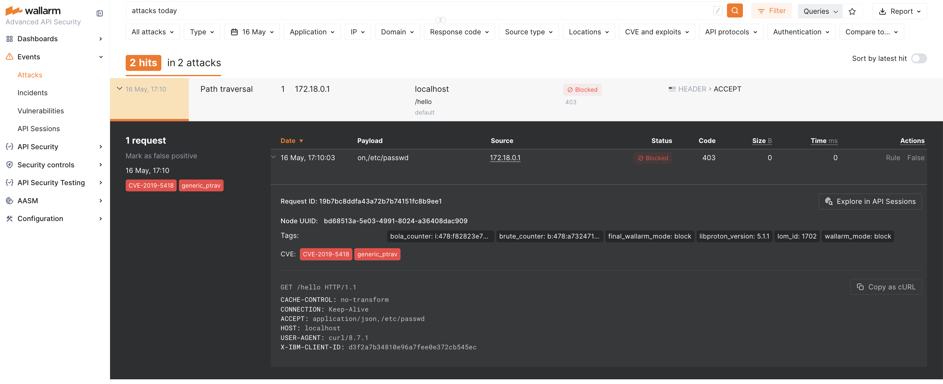 curl -k --request GET --url https://localhost:9444/<PATH ALLOWED BY SPEC> \ --header 'X-IBM-Client-Id: <YOUR IBM CLIENT ID>' \ --header 'accept: /etc/passwd'According to IBM API Connect behavior, only requests matching the defined OpenAPI paths will be inspected by the Wallarm Node.