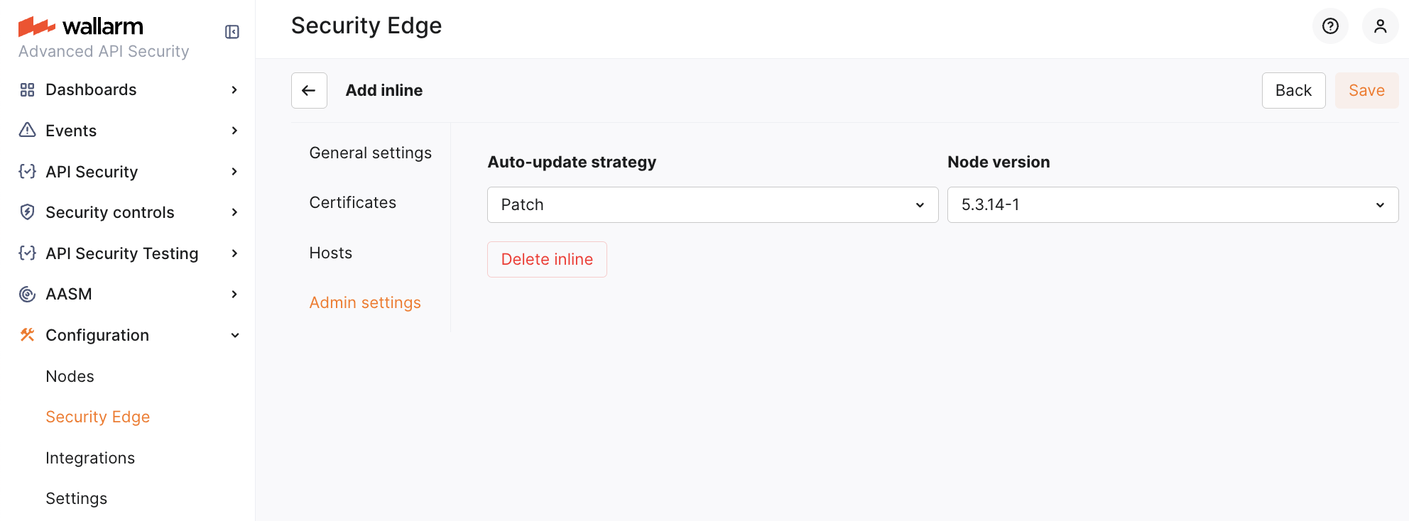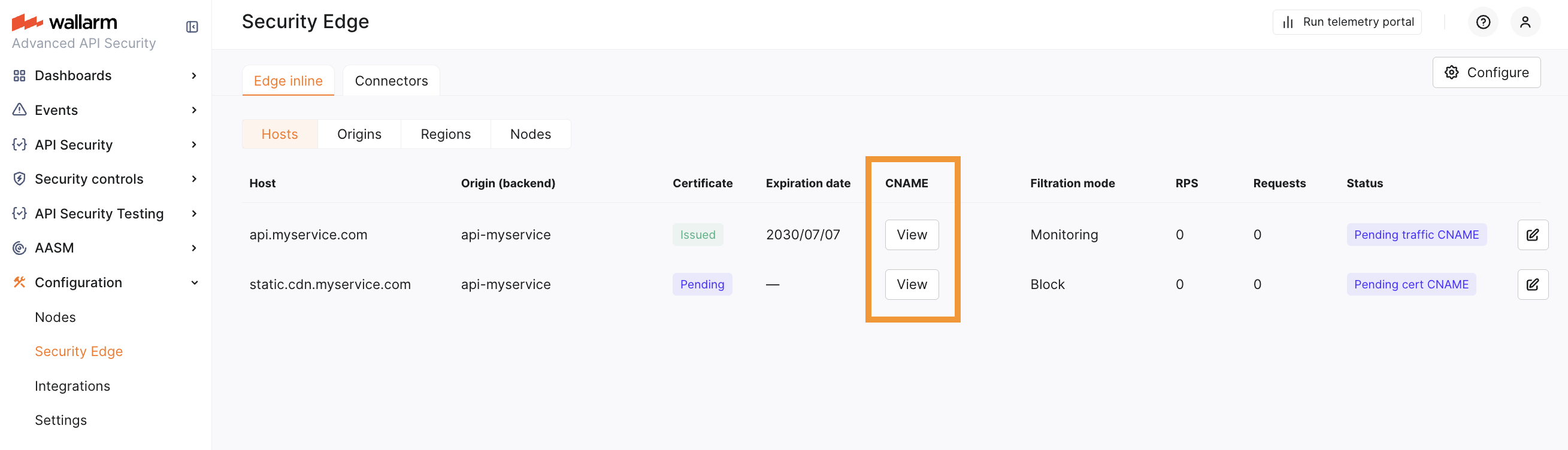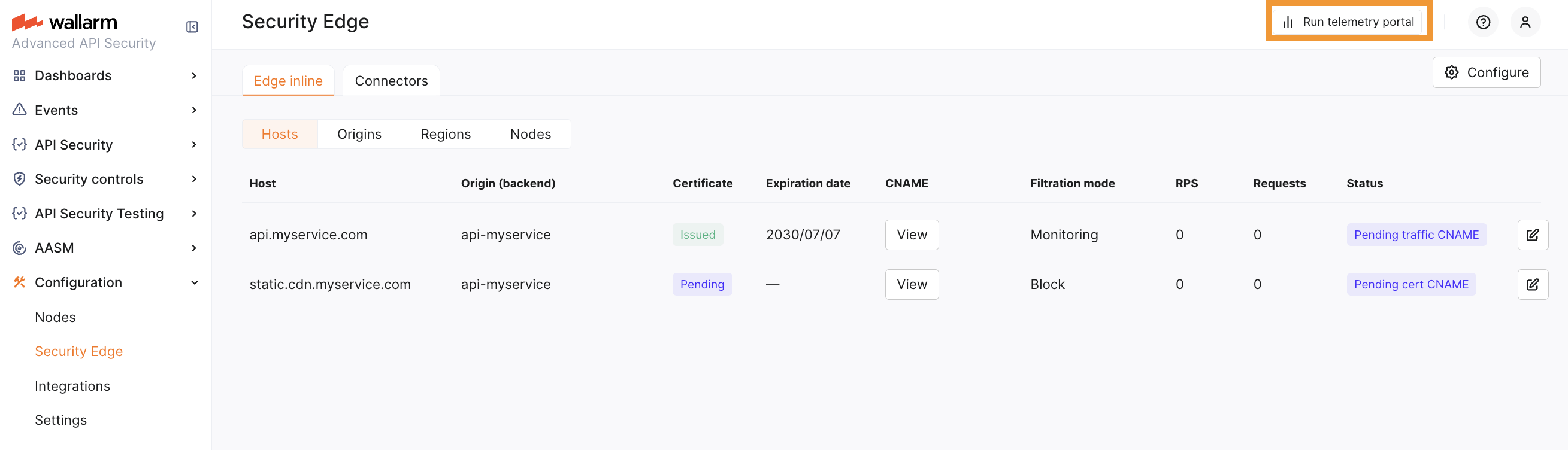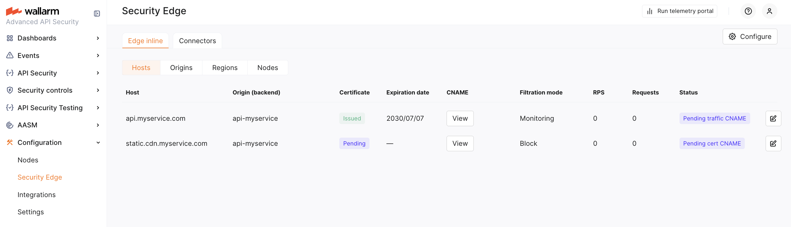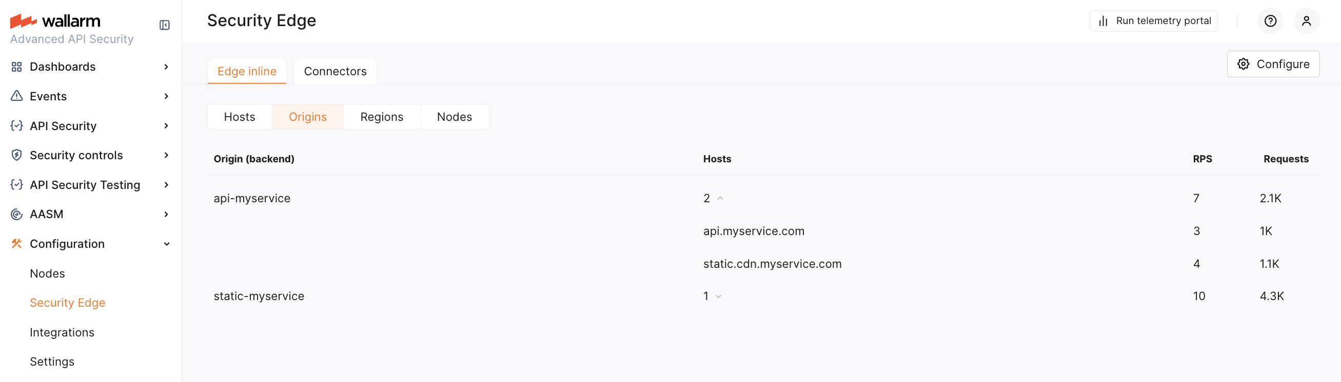 To run the Edge inline, go to the Wallarm Console → Security Edge → Edge inline → Configure. You can configure multiple origins to forward traffic to and multiple hosts to protect.