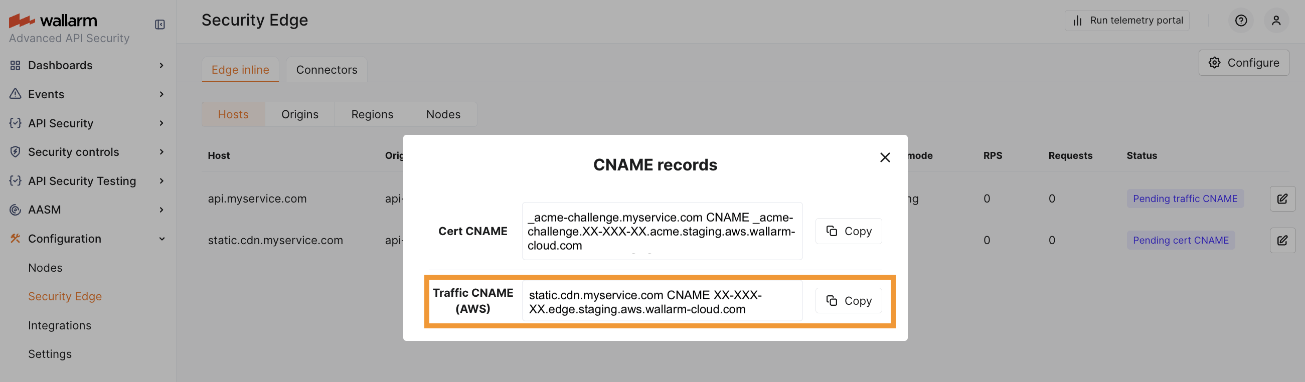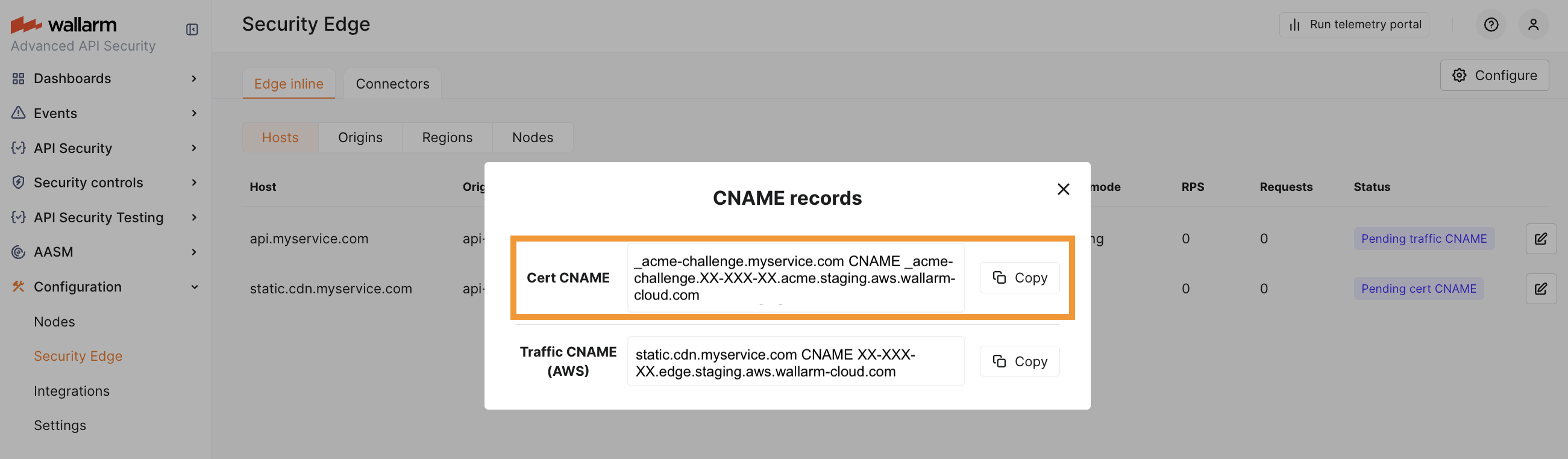 DNS changes can take up to 24 hours to propagate. Wallarm starts the Edge node deployment once the CNAME records are verified.