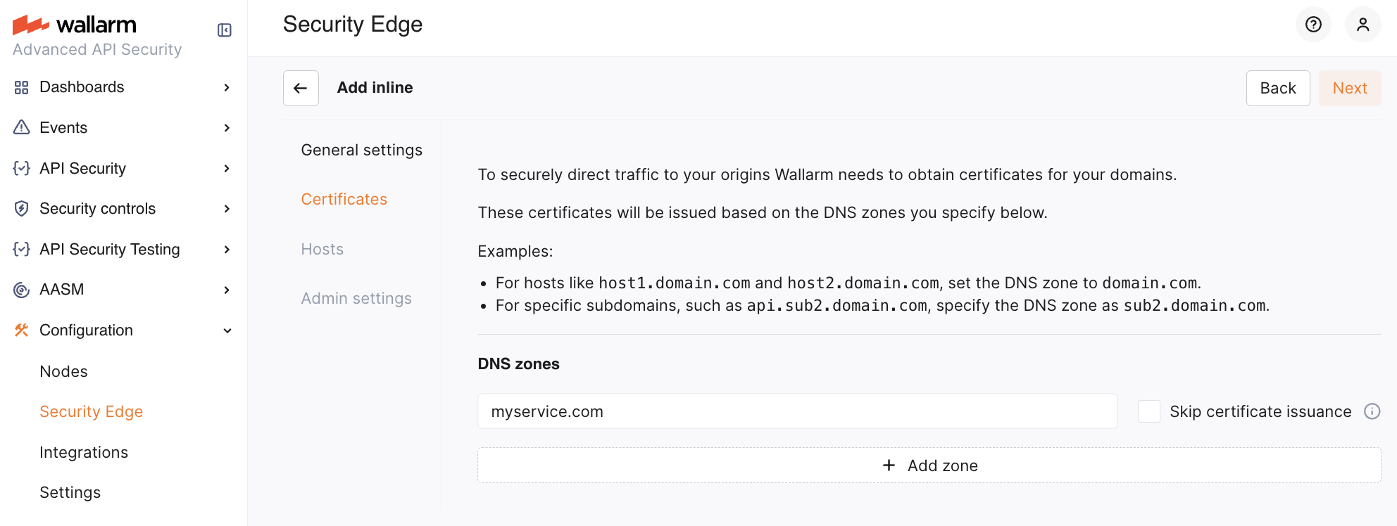 If the Edge Inline node is deployed as a direct, Internet-facing solution, Wallarm requires certificates to securely route traffic to your origin servers. Certificates are issued based on the DNS zones specified in this section.