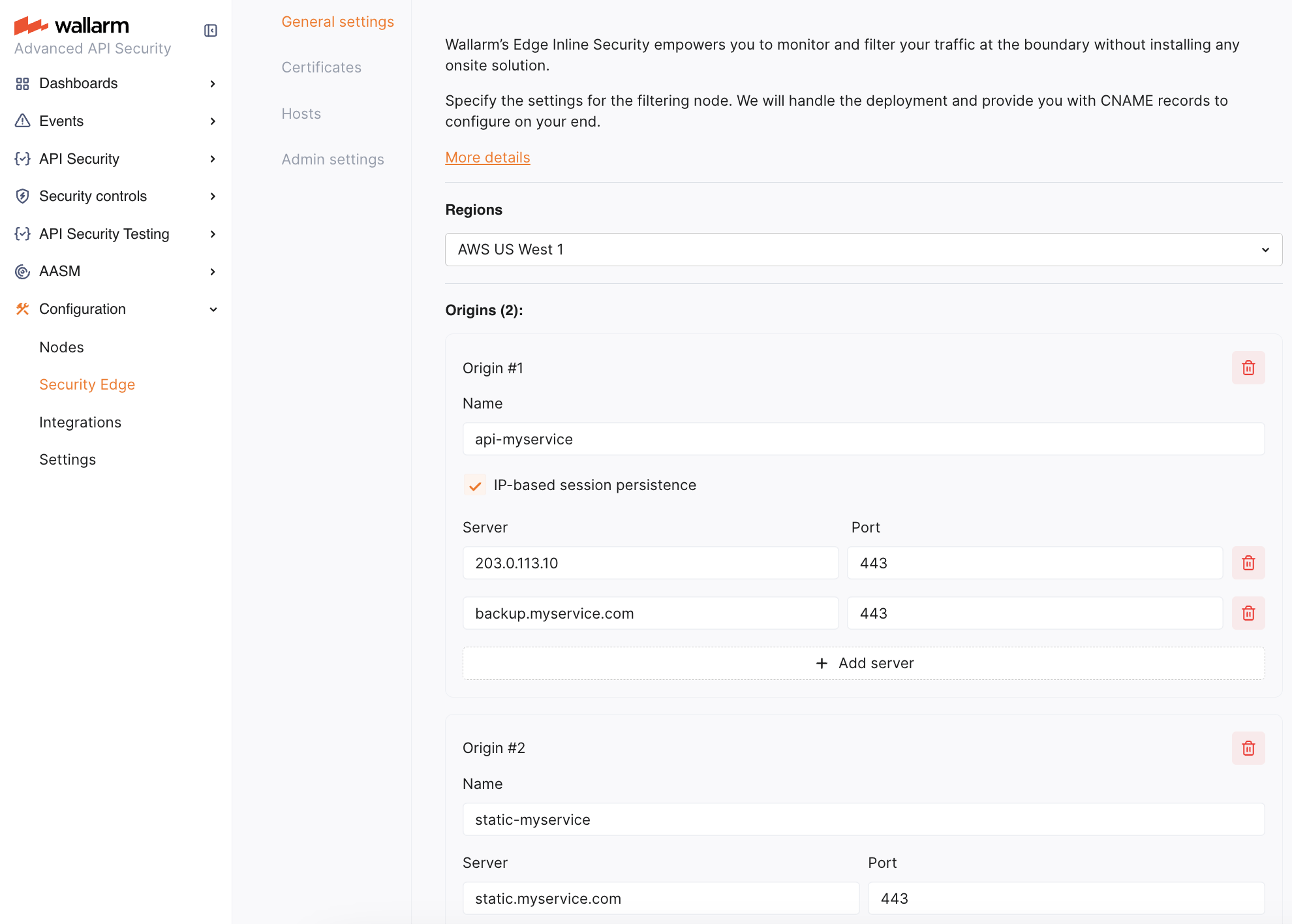 Specify origins to which the Edge node will forward filtered traffic. For each origin, provide a server IP address, domain name, or FQDN with an optional port (default: 443).