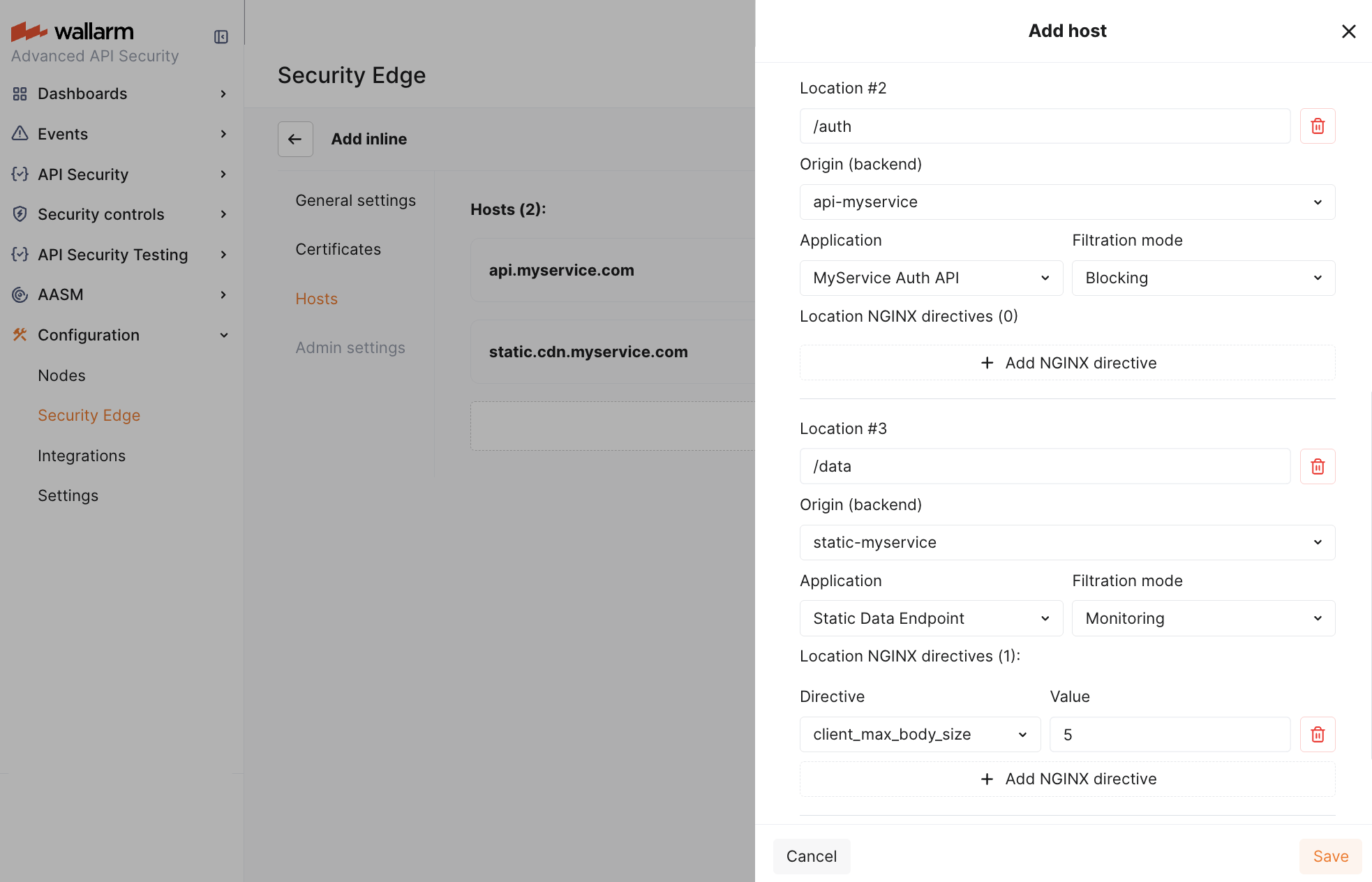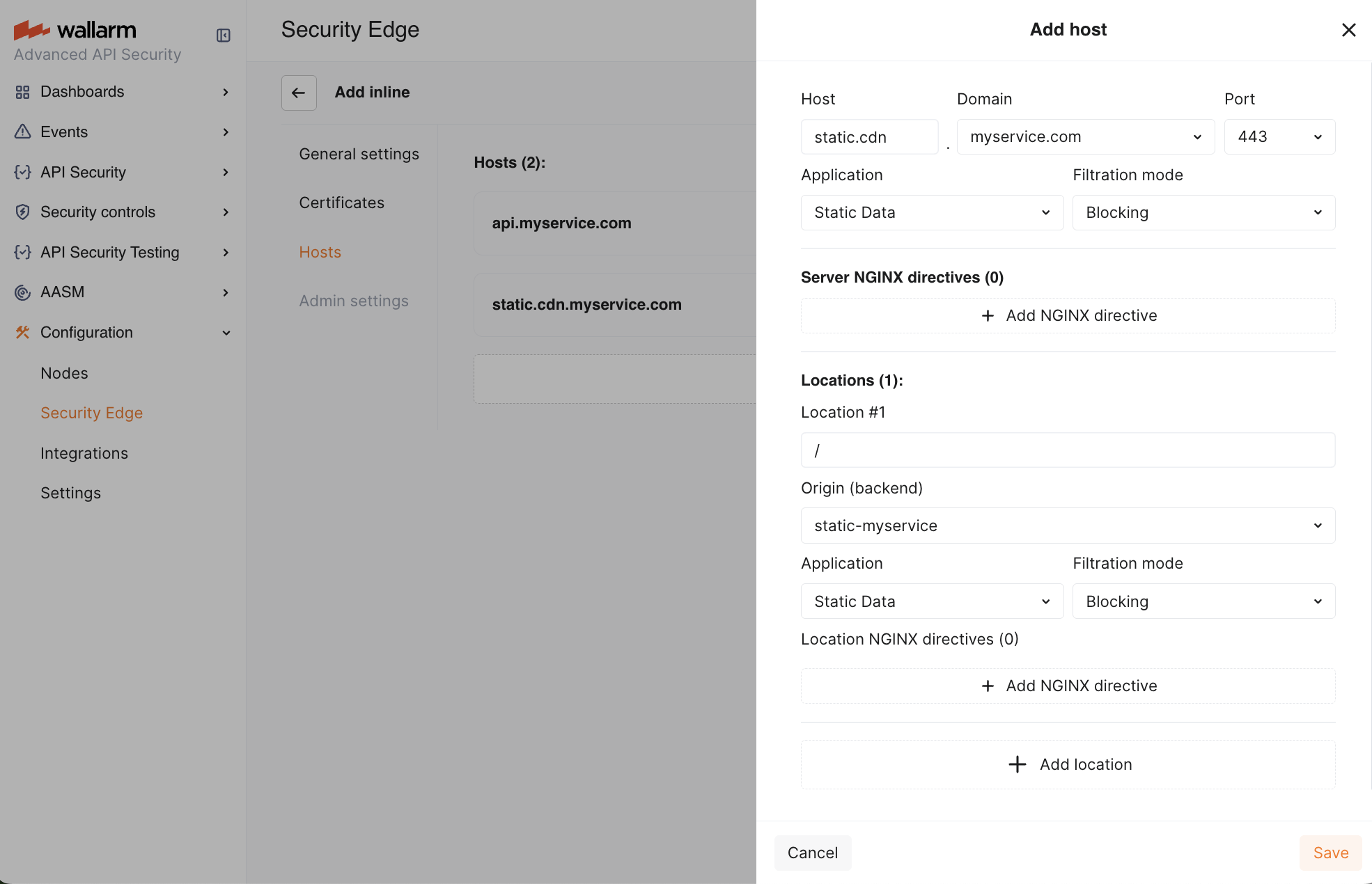 Specify the domains, ports and subdomains that will direct traffic to the Wallarm node for analysis. Each host entry must match a DNS zone previously defined in Certificates.