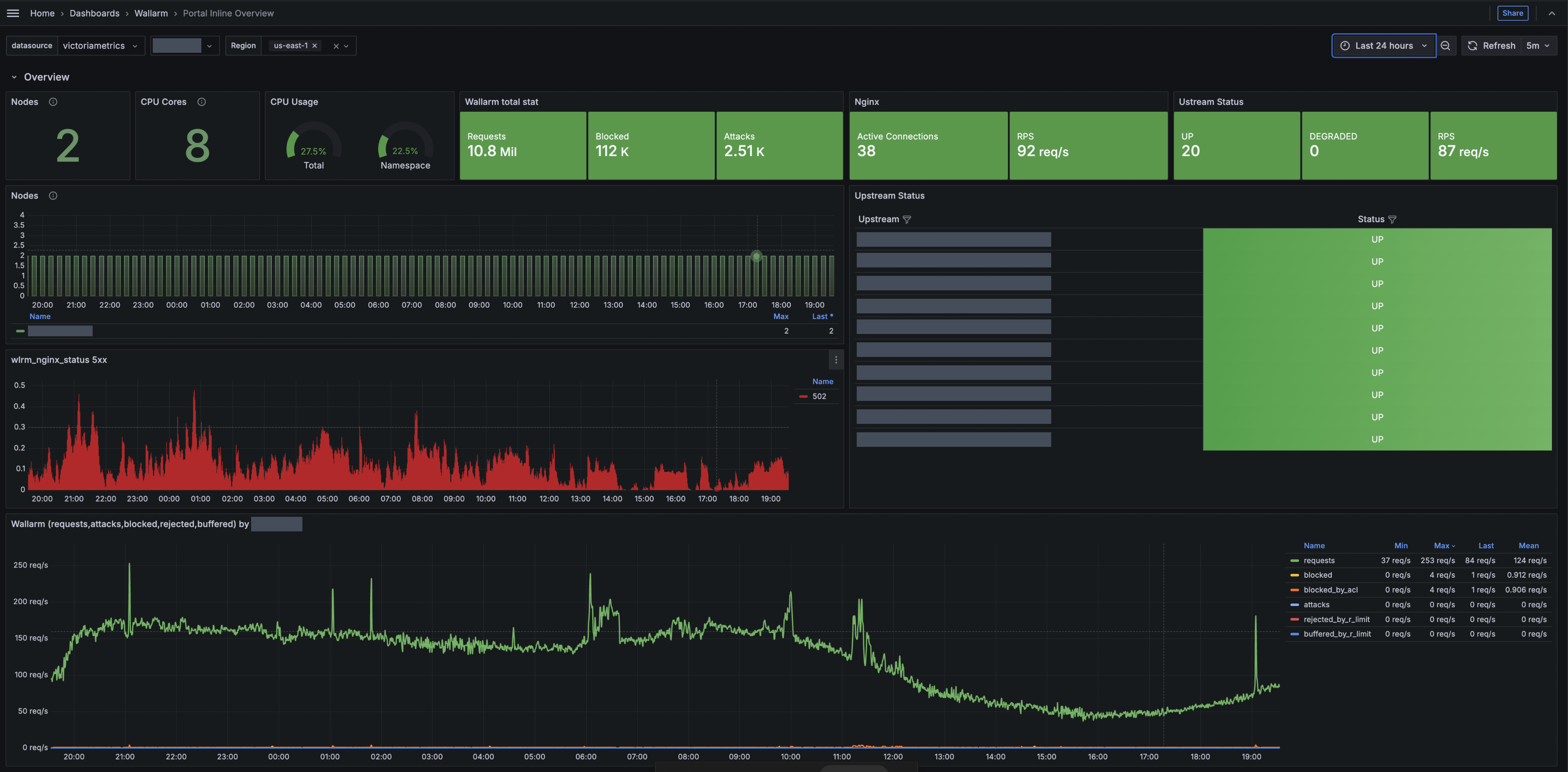 The telemetry portal for Security Edge Inline provides a Grafana dashboard with real-time insights into metrics on traffic processed by Wallarm.
