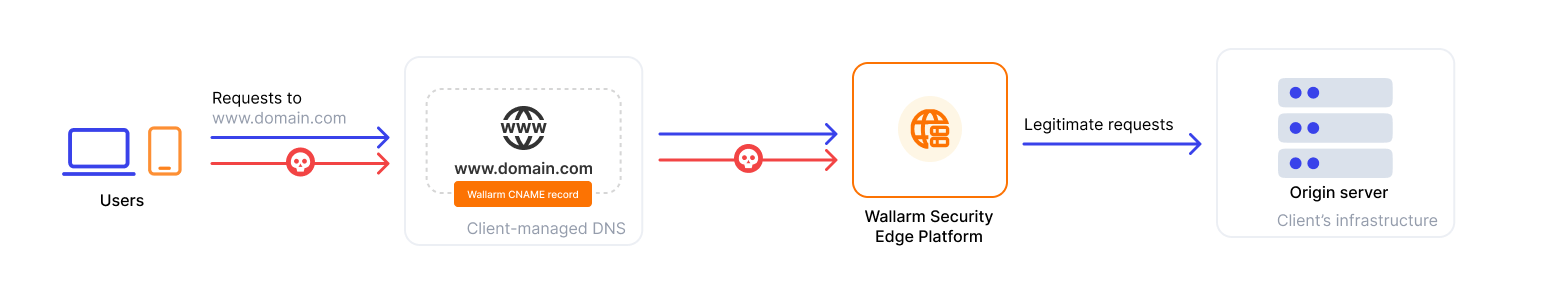 This is an ideal solution for securing APIs when you can redirect traffic from your hosts to Wallarm's edge nodes by modifying the CNAME records in your DNS settings.