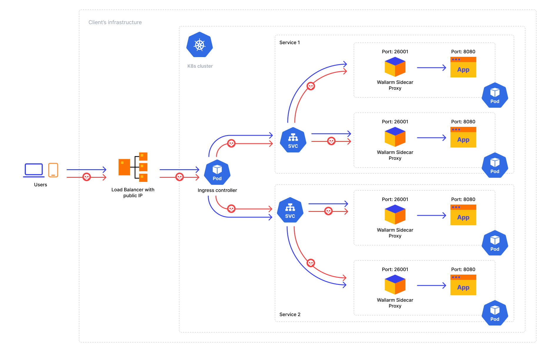 To secure an application deployed as a Pod in a Kubernetes cluster, you can run the NGINX-based Wallarm node in front of the application as a sidecar controller. Wallarm sidecar controller will filter incoming traffic to the application Pod by allowing only legitimate requests and mitigating malicious ones.