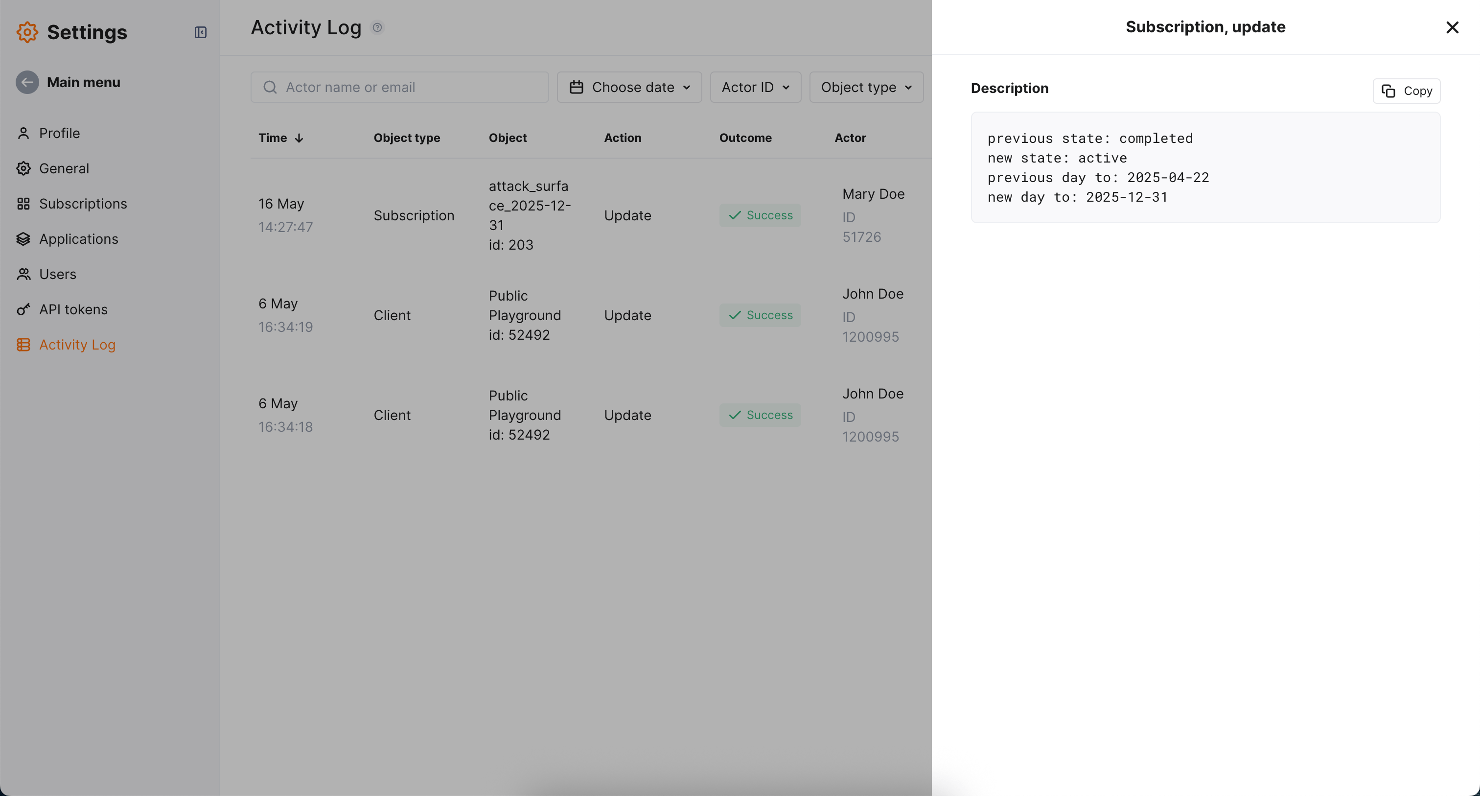 In the SettingsActivity Log section of Wallarm Console, you can check the history of activities in the Wallarm system.